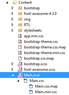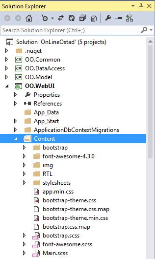 2 - بعد از نصب BootStrap SSAS Source و Font Awesome SSAS فولدر font-awesome-4.3.0 و bootstrap را به کمک gulp یا به صورت دستی در فولدر CSS های پروژه (در Asp.Net MVC فولدر Content) کپی کنید و دو فایل bootstrap.scss و font-awesome.scss را از محل نصب به کمک gulp یا به صورت دستی , داخل فولدر CSS های پروژه (در Asp.Net MVC فولدر Content) قرار دهید. همانند شکل زیر :