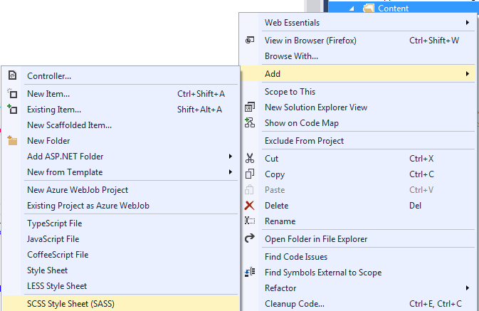 5 - بر روی فولدر حاوی فایل های CSS پروژه خود کلیک کرده و همانند شکل زیر یک فایل از نوع SASS با نام Main اضافه کنید :