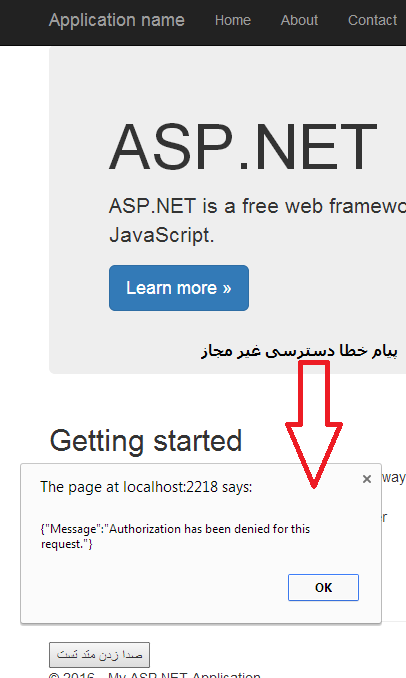 با کلیک بر روی دکمه صدا زدن متد تست , همانند شکل زیر خطای Authorizaion را دریافت خواهید کرد و این دقیقا" همان رفتاری است که ما انتظار داشتیم